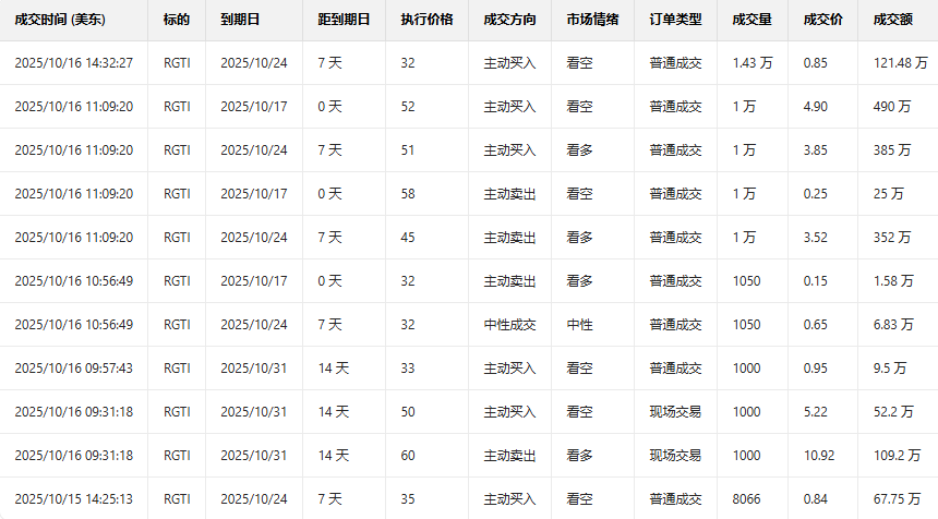 二、美股期权成交榜1、Rigetti Computing上一交易日跌14.86%,前一日认沽/认购比例上,成交量上行,空头交易活跃。