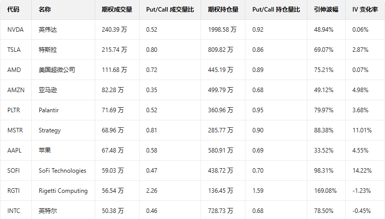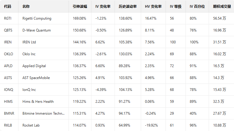 美股引申波动幅度排行榜前十(标的市值>100亿美元,且期权成交量>10万美元)