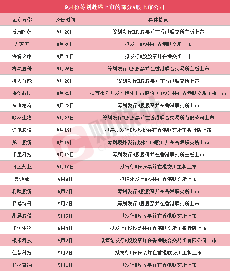 从港股市场环境来看,据财联社不完全统计,9月约20家A股上市公司公告筹划赴港上市。