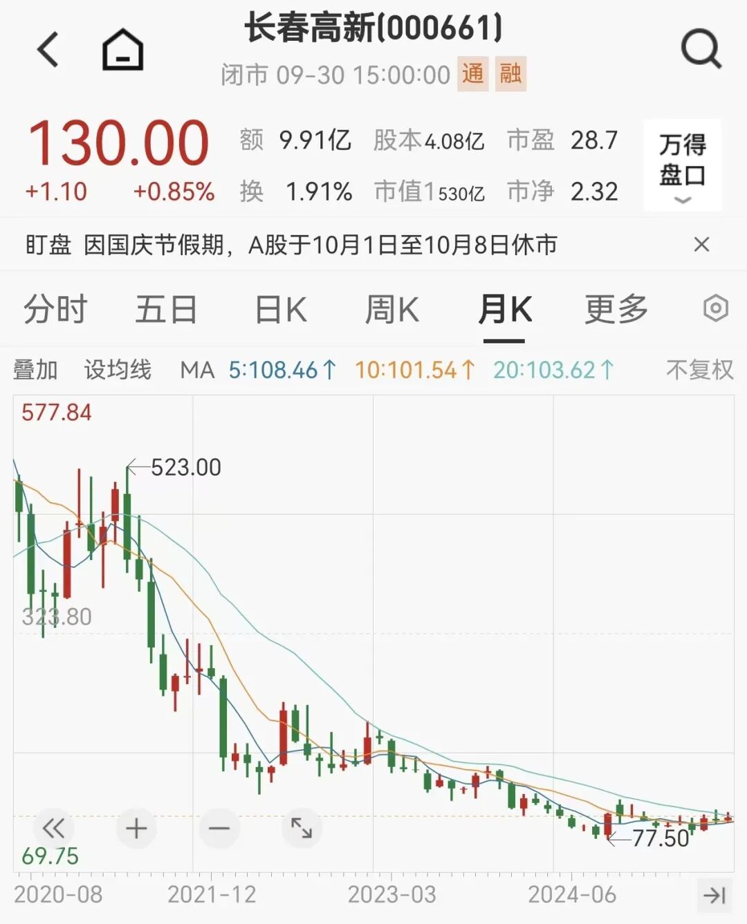 2021年5月长春高新市值曾超过2100亿元,截至2025年9月30日,长春高新总市值为人民币530亿元,已缩水约1570亿元。