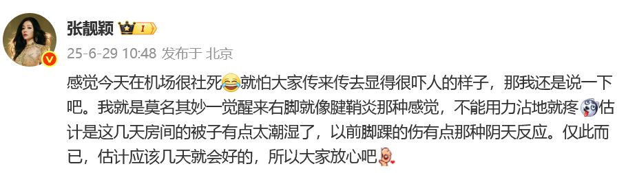 今年以来,张靓颖身体状况多次引发关注。6月29日,张靓颖回应脚伤:“感觉今天在机场很社死,就怕大家传来传去显得很吓人的样子,那我还是说一下吧。我就是莫名其妙一觉醒来右脚就像腱鞘炎那种感觉,不能用力沾地就疼。估计是这几天房间的被子有点太潮湿了,以前脚踝的伤有点那种阴天反应。仅此而已,估计应该几天就会好的,所以大家放心吧。”