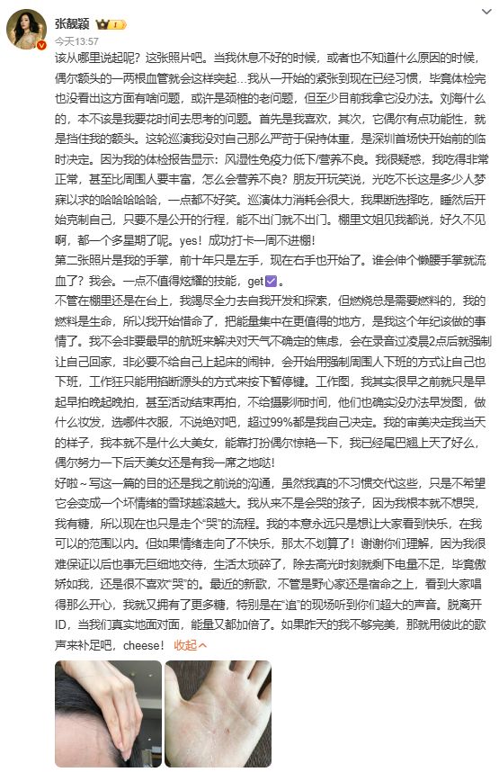 8月25日,张靓颖微博发文谈自己的健康状况:“当我休息不好的时候,或者也不知道什么原因的时候,偶尔额头的一两根血管就会这样突起……我从一开始的紧张到现在已经习惯,毕竟体检完也没看出这方面有啥问题,或许是颈椎的老问题,但至少目前我拿它没办法。”