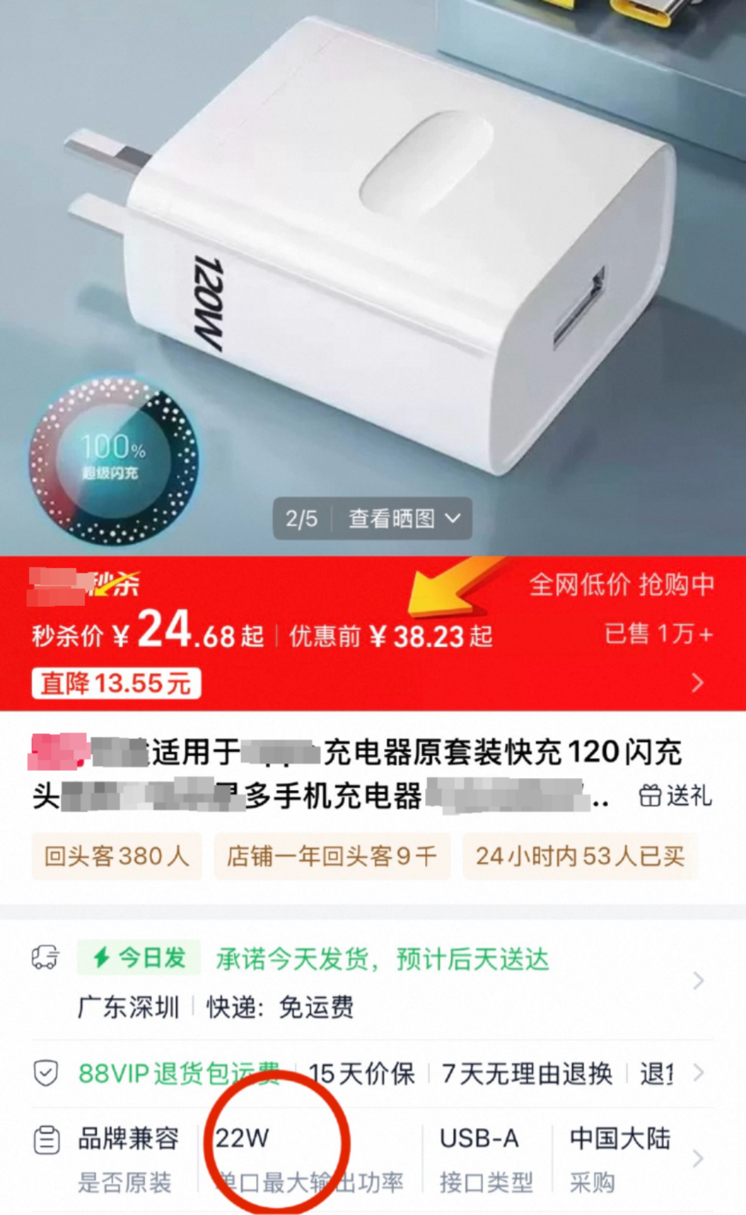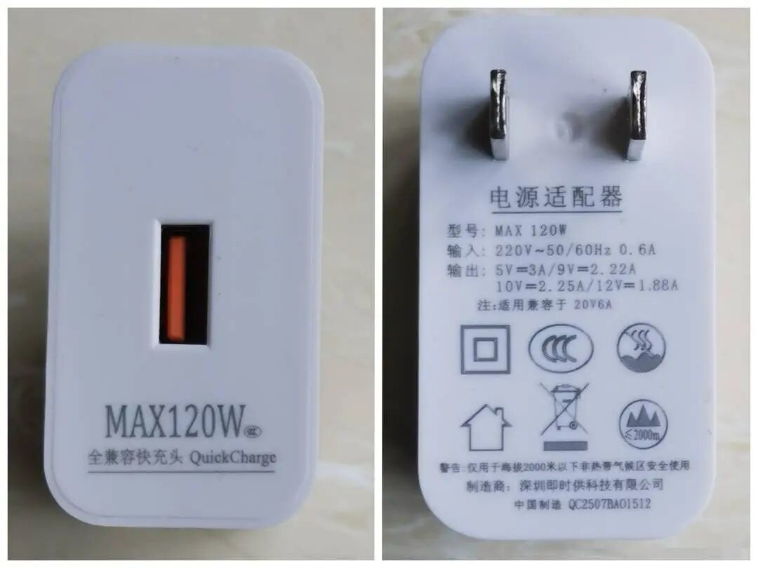 北京一位网友称,他买到的一款“MAX120W全兼容快充头”,到手后却发现,输出“5V 3A/9V 2.22A”“10V 2.25A/12V 1.88A”,只是在下方备注了“适用兼容于20V 6A”,“懂一点的都知道,实际输出功率22.5W。”
